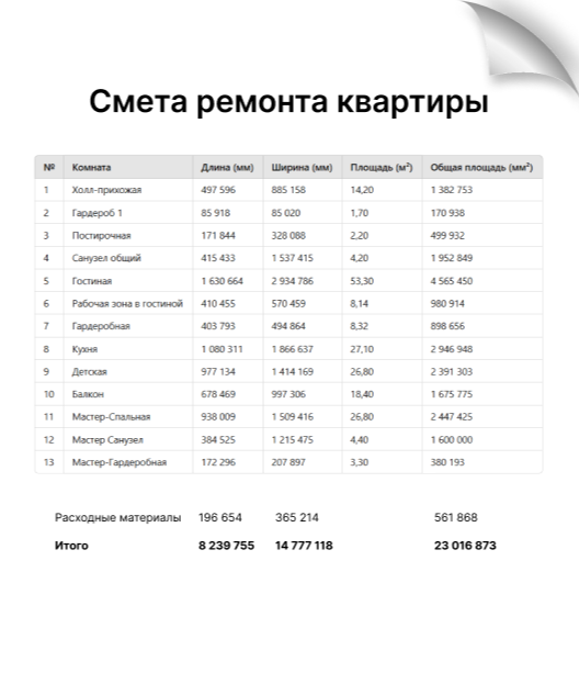С помощью сервиса быстро получил смету с итоговыми цифрами на работы и материалы. Прикинул, где можно сэкономить, понял свой бюджет. Это помогло сравнить вариант с ремонтом и покупкой готовой квартиры. В итоге смог быстро принять решение, куда выгоднее вложиться. Отдельное спасибо команде — сработали оперативно и по делу.